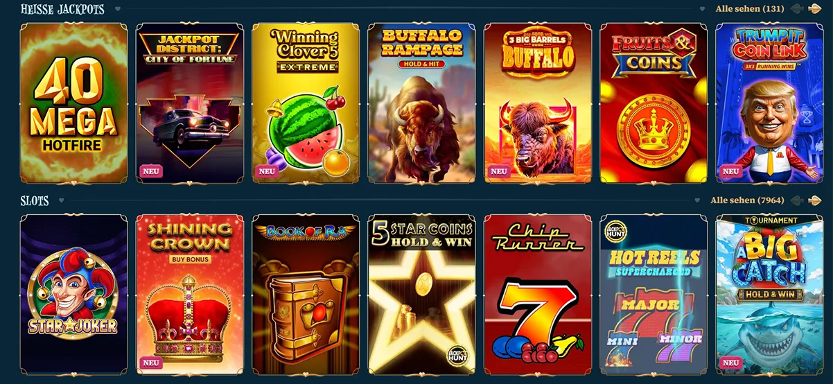 Die Benutzeroberfläche verbindet elegantes Design mit praktischer Funktionalität. Am oberen Bildschirmrand finden Sie die Hauptkategorien. Die beliebtesten Spiele werden direkt auf der Startseite präsentiert.