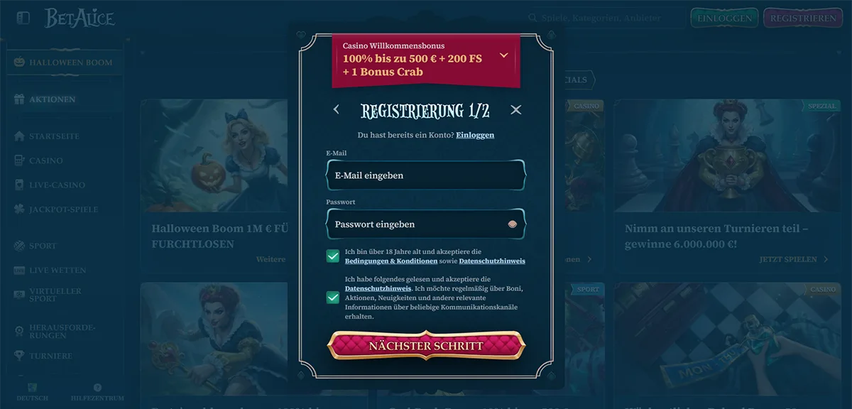 Die Anmeldung bei BetAlice Casino ist einfach und schnell. Neue Spieler füllen ein Formular aus und bestätigen ihre E-Mail-Adresse.