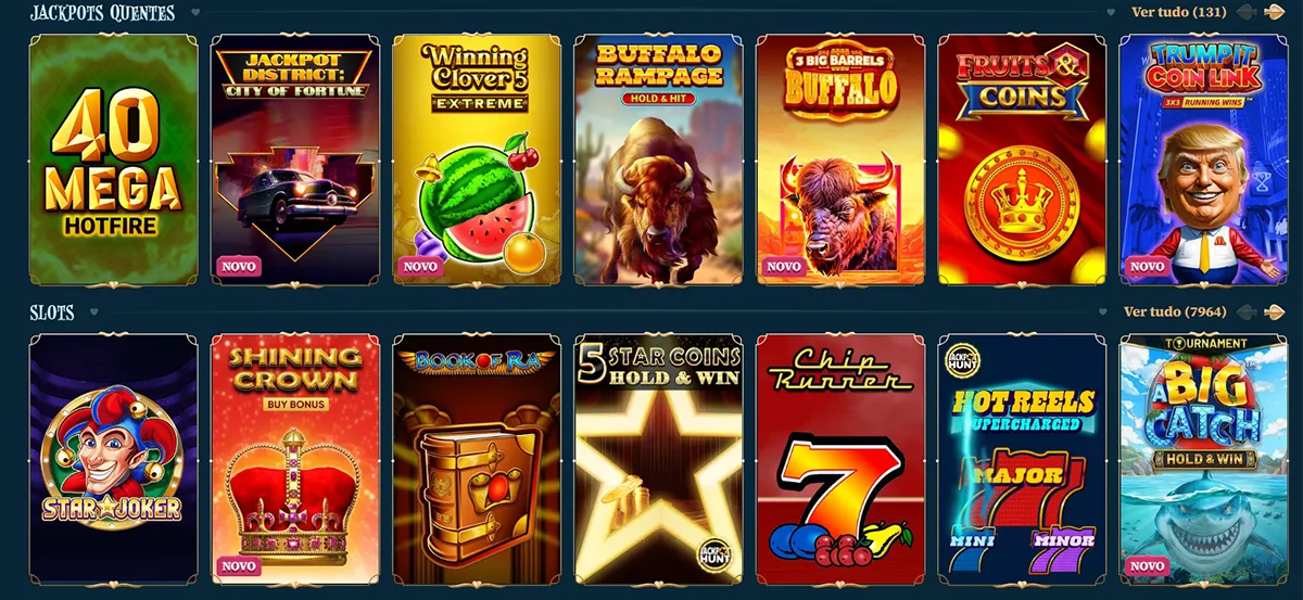 Nossa coleção de slots inclui títulos dos principais fornecedores como NetEnt, Pragmatic Play e Play'n GO. Disponibilizamos caça-níqueis clássicos de 3 rolos e slots de vídeo modernas com até 6 rolos.